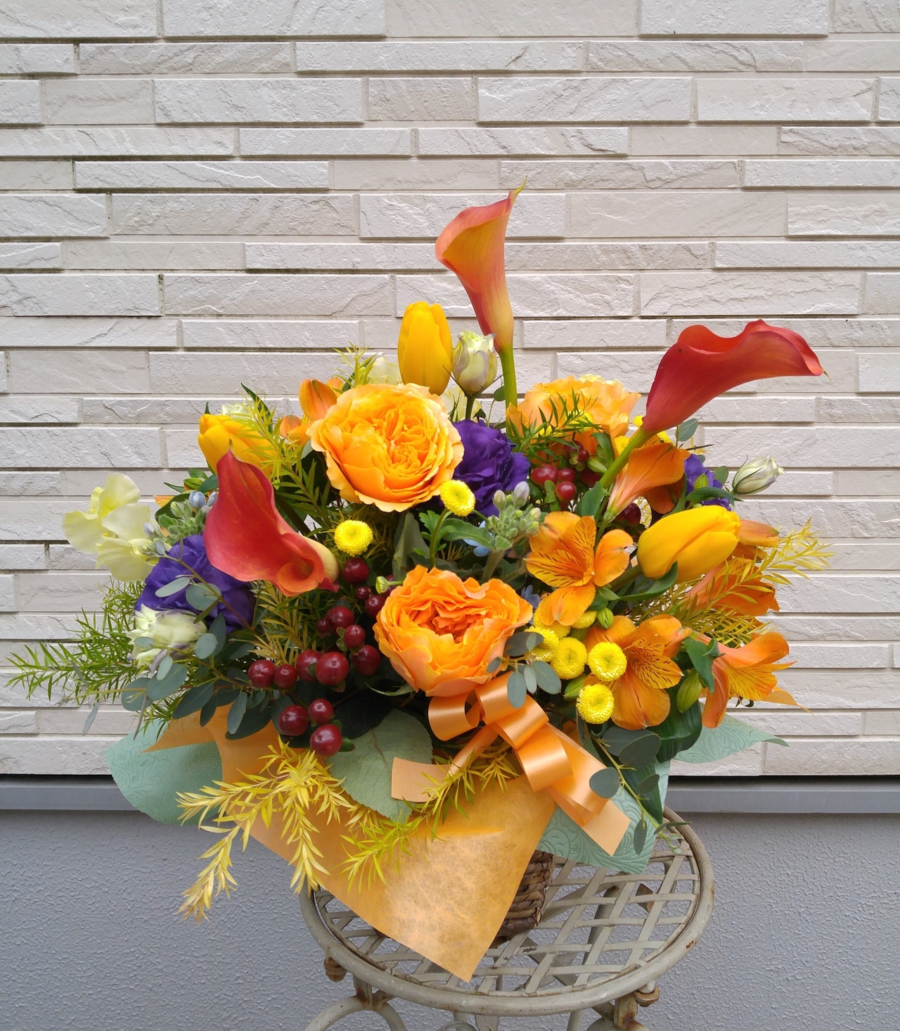 ビタミンカラーを中心とした元気な色合いのアレンジメントです。